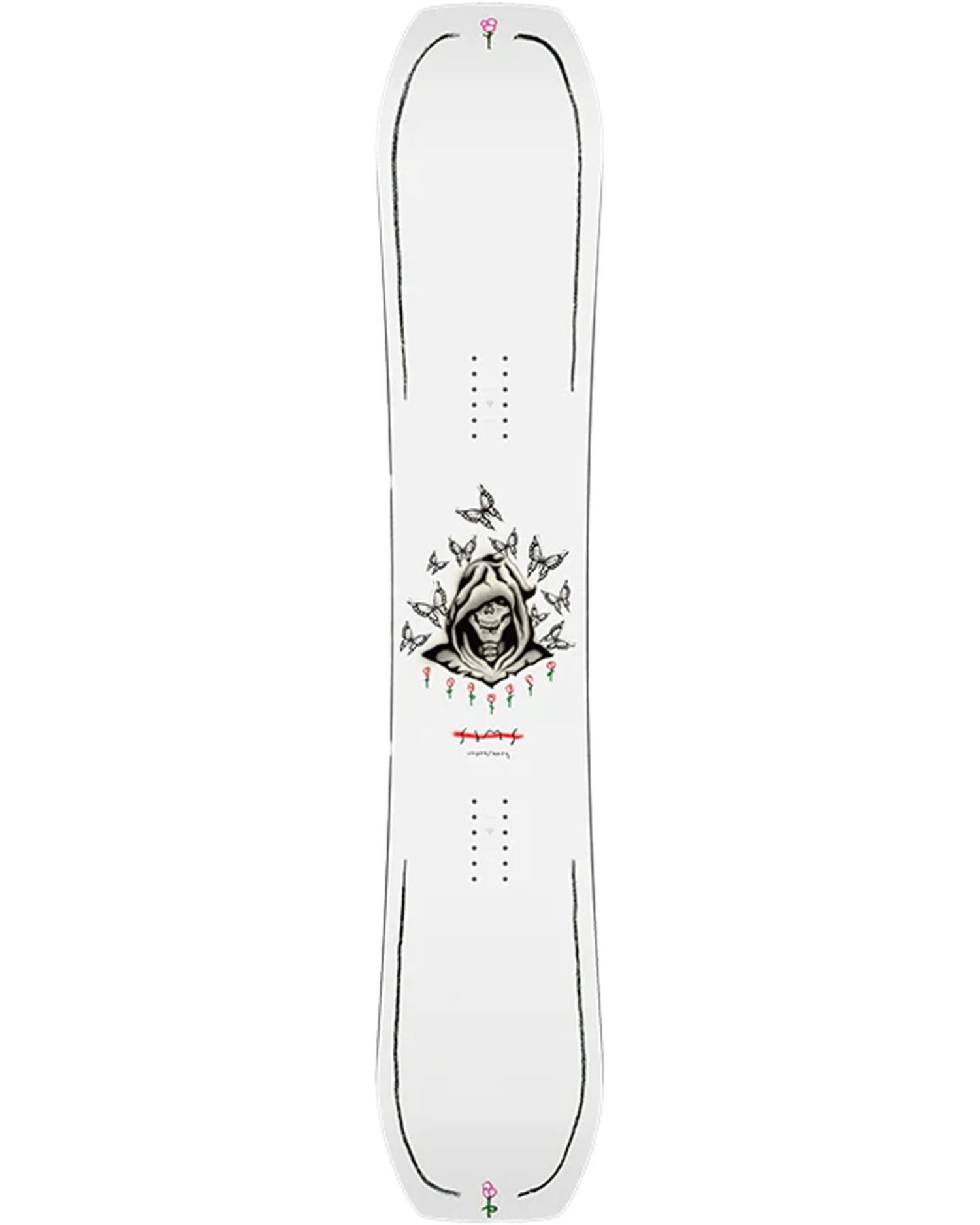 The Undertaker’s classic blunt tip and tail twin profile are designed to reduce swing weight to an absolute minimum, creating a balanced overall ride giving the rider complete control of the board, and helping to stomp even the most technical of tricks. However, giving it a slightly longer nose gives you all the balance and control you need, but with increased all-terrain versatility. The Undertaker’s advanced sidecut combines longer radii at the tip and tail with a tight radius in the centre of the board. This combination ensures that when the board runs straight, i.e. on the run into a jump or rail, it tracks straight and feels stable and predictable. However, the deeper section between the feet powers up and gives a more dynamic carve when driving through a carve.