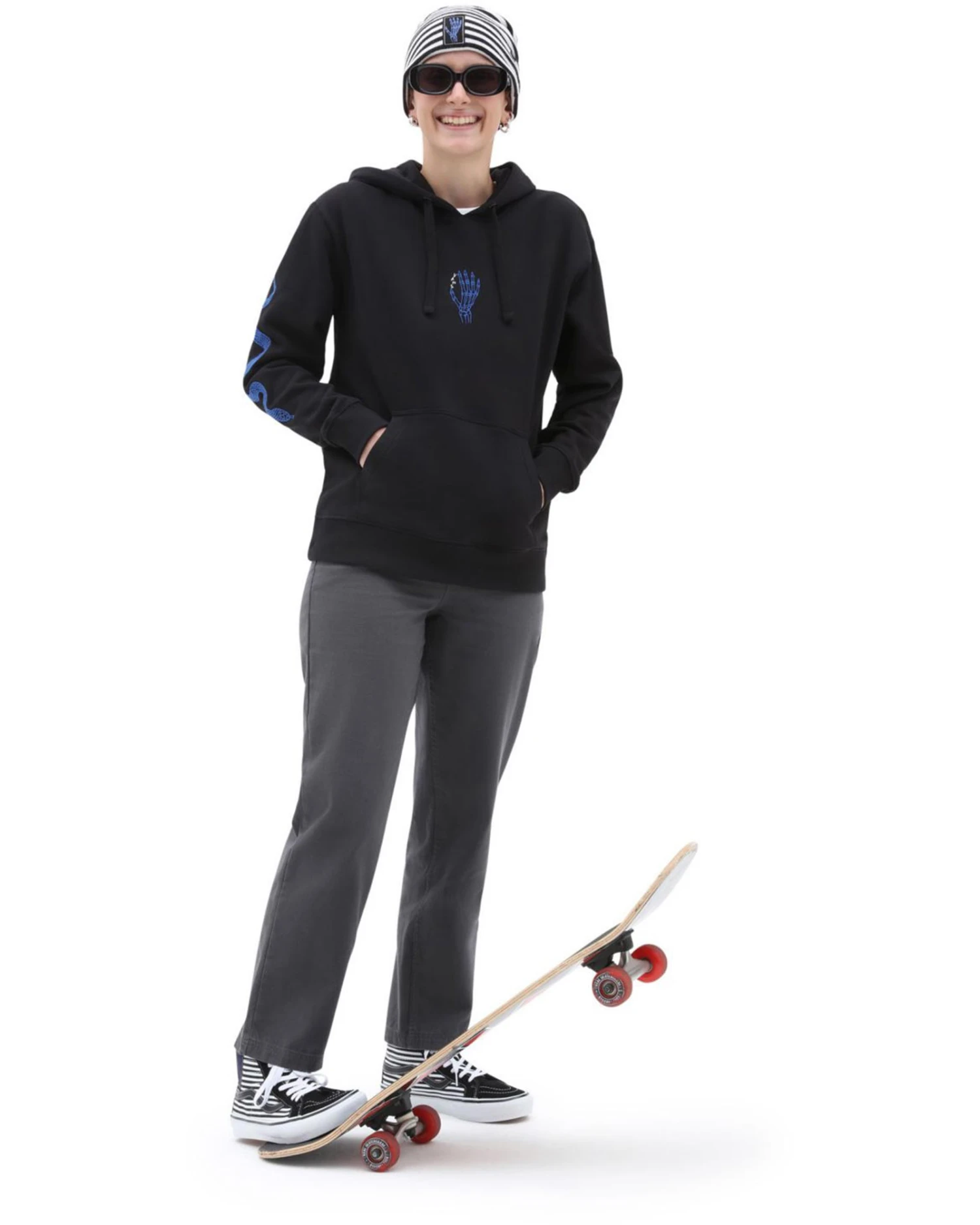 Teaming up with Breana, the Vans X Breana Geering Skate Pullover Hoodie blends style and functionality, being made to skate but also cut to work just as well off the board. The hoodie has a front pouch pocket and features an embroidered skeleton hand on the front chest and snake design down the right sleeve.